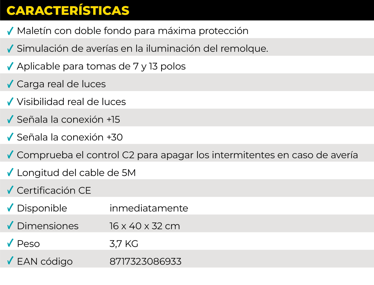 El dispositivo perfecto para verificar todas las señales del kit de cableado recién instalado ya está disponible en ECS Electronics BV. Este dispositivo le permite comprobar las señales de iluminación para el funcionamiento correcto del remolque.